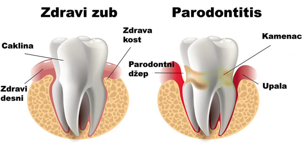 Parodontne bolesti započinju nakupljanjem patogenih bakterija. Naslage bakterijskog plaka i kamenca dovode do upale koja razara potporna tkiva zuba.